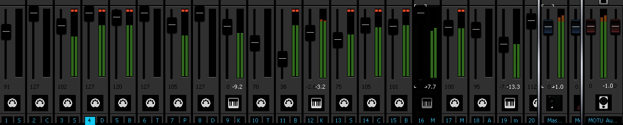 A portion snapshot of the mixing console during the track "Rise & Fall - Overture"